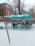 Небольшая, но качественная и современная детская площадка. Есть зона для малышей и детей постарше. А также для взрослых тренажёрная зона под навесом.