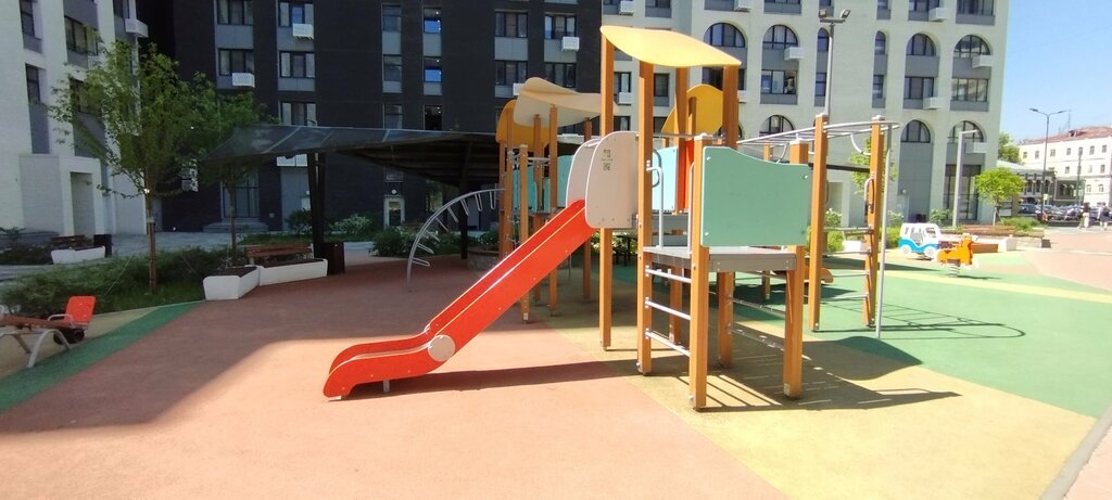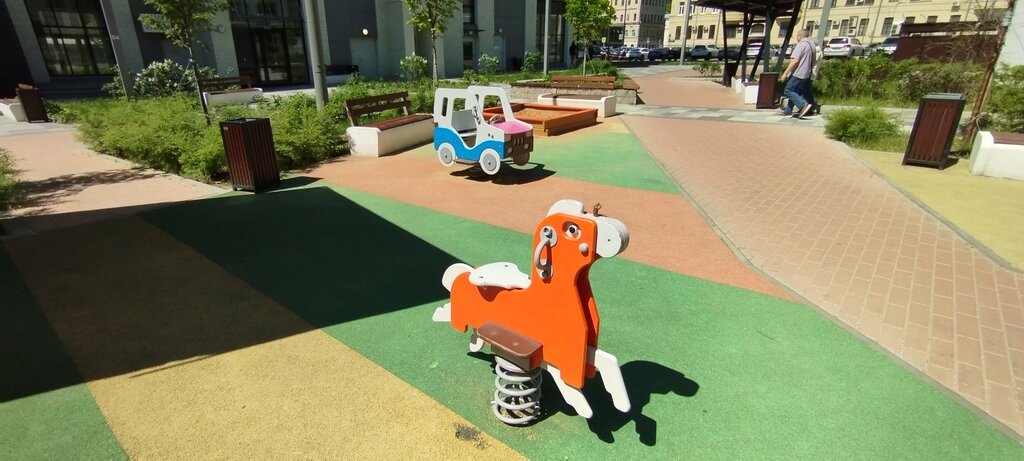 Новая современная площадка для детей с мягким искусственным покрытием. Здесь установлены детский игровой комплекс с горкой, балансирные качели, качалки на пружинах, песочница, столы и скамейки для настольных игр. Часть площадки защищена навесом необычной формы. Достаточное количество скамеек разных форм.
