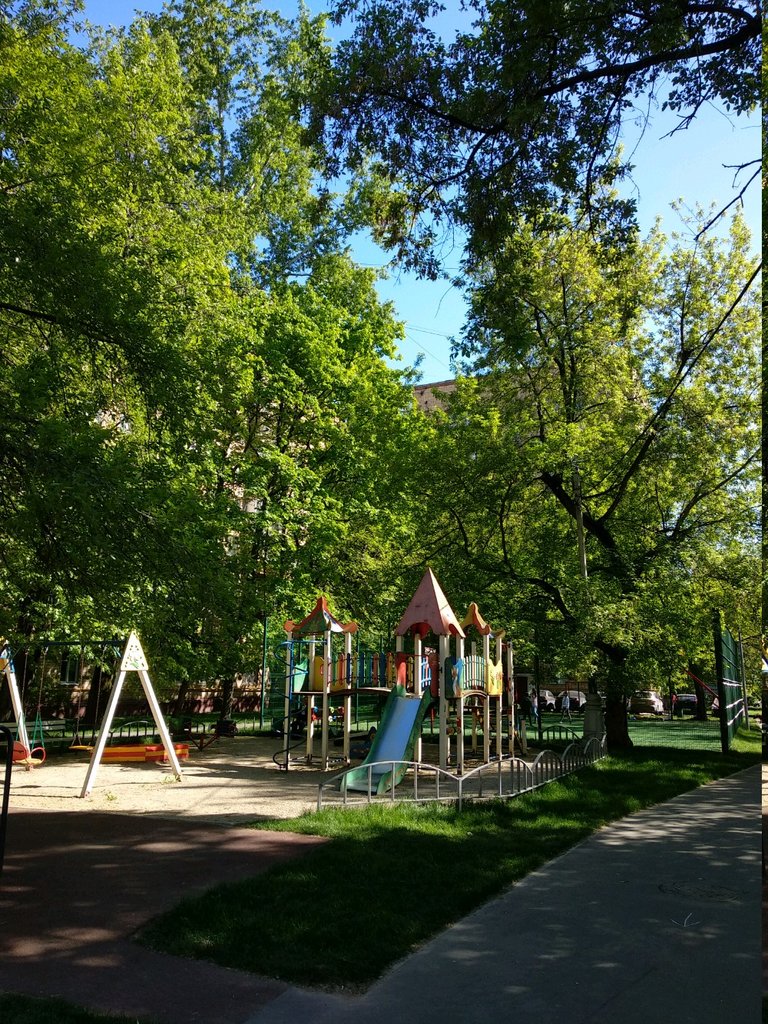 Интересный городок, площадка с тренажёрами, лавочки в тени лип.