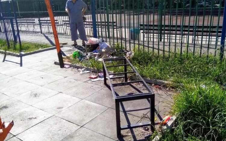 Территория захламлена и никем не убирается. Здесь свалка старых пружинных матрацев. Они свалены под турниками. а ведь там металлические пружины, которые представляют опасность для детей. Качели, тренажёры и лавочки сломаны. Песочница забыла как выглядит песок.