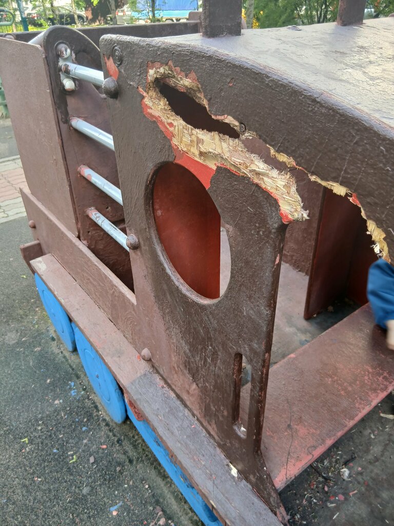 Площадка находится в плачевном состоянии. Ей больше 10лет. Конечно уже все доски сгнили, ломаются ступеньки, шатается большой игровой комлекс. На все жалобы жителей, УК просто в очередной раз красит площадку в краску, которая воняет и сохнет месяц. Из-за толстого слоя, краска уже просто отваливается. Сломалась малышковая горка у песочницы, так УК сняли горку с пожарной машины - вот так они реагируют на обращееия жителей. Качели для малышей без перекладины между ног. Уже неоднократно дети вылетали с них и получали травмы. Футбольное поле: сломаный забор, старое покрытие. На этой площадке всегда много детей, но УК не торопится производить замену. Наверно, ждет пока площадка под кем-нибудь развалится и будет обращение в вышестоящие органы.