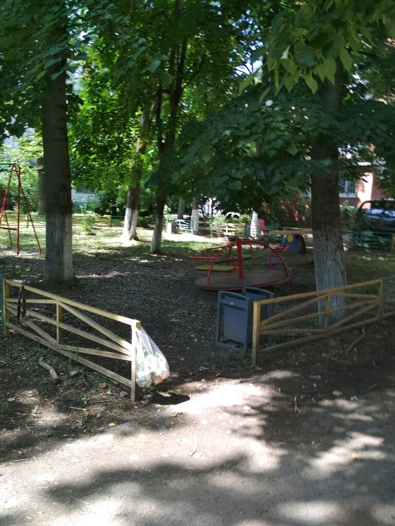 Это обычный двор 5тиэтажки, старые убитые игровые качели, единственным развлечением было у детей лазить на большое древнее дерево - говорят упал с него мальчик и сломал конечность, после этого спилили векового гиганта... лучше внешне уж точно не стало!