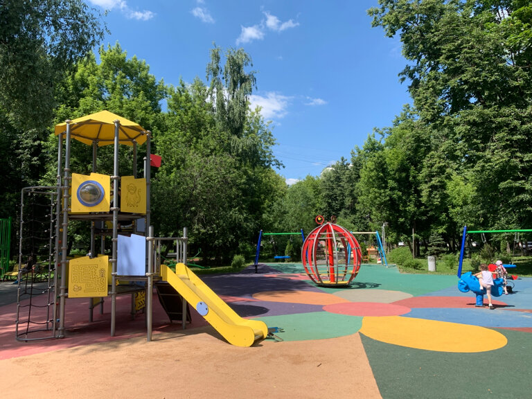 на всех площадках резиновое покрытие, все качели-карусели функционируют)