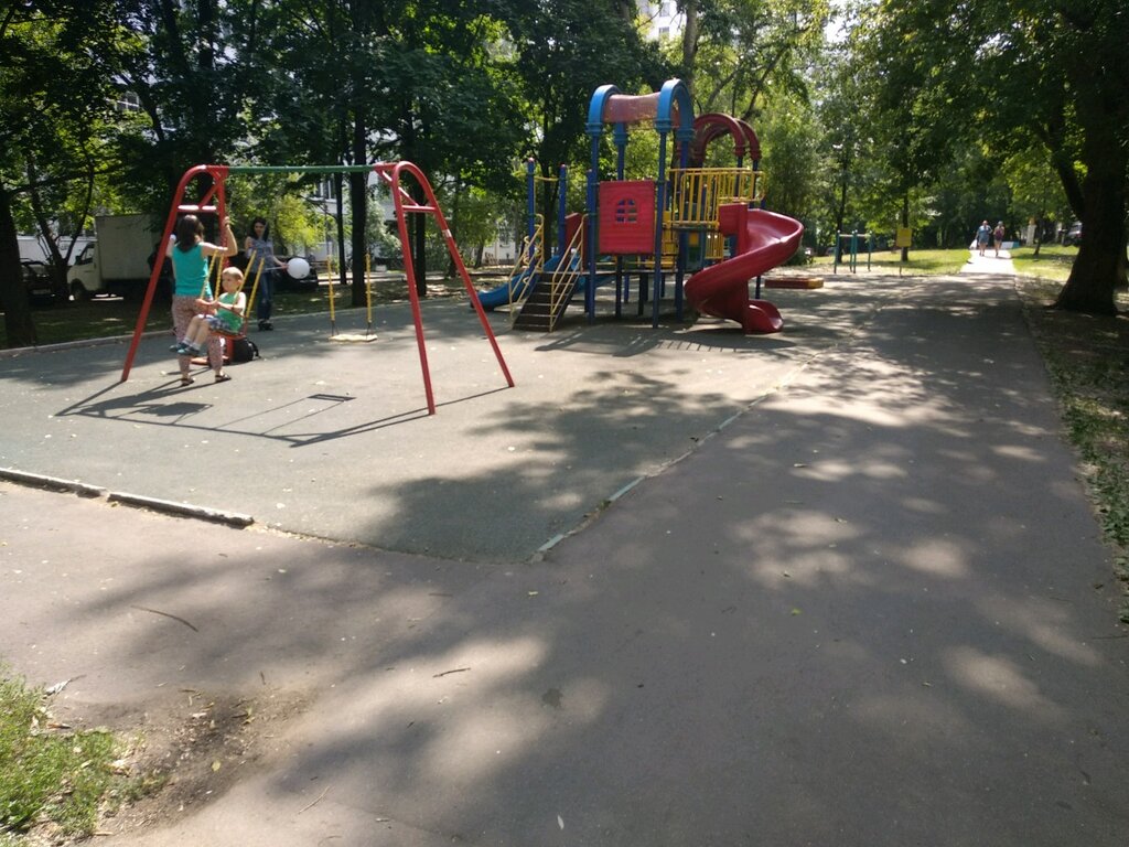 Хорошая и большая детская площадка от 3 до 12 лет, хорошее освещение, есть скамейки и урны, всегда чисто - дворникам отдельное спасибо! -снег чистят регулярно вплоть до покрытия.