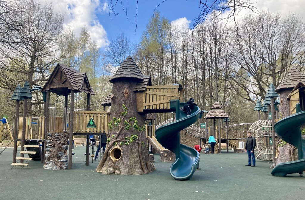 Площадка сделана с любовью к природе. Всё оформлено в эко-стиле: горки в виде старых дубов, из которых выглядывают белочки, лазалки из пеньков и брёвен. Ощущение, что играешь в сказочном лесу. Атмосфера приятная: зелень, пение птиц, никакого городского шума, т.к. находится в сердце парка.