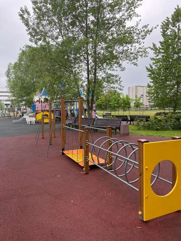красивая и большая площадка есть качели, турники, горки и площадка в виде замка советую зайти, будет интересно детям любого возраста