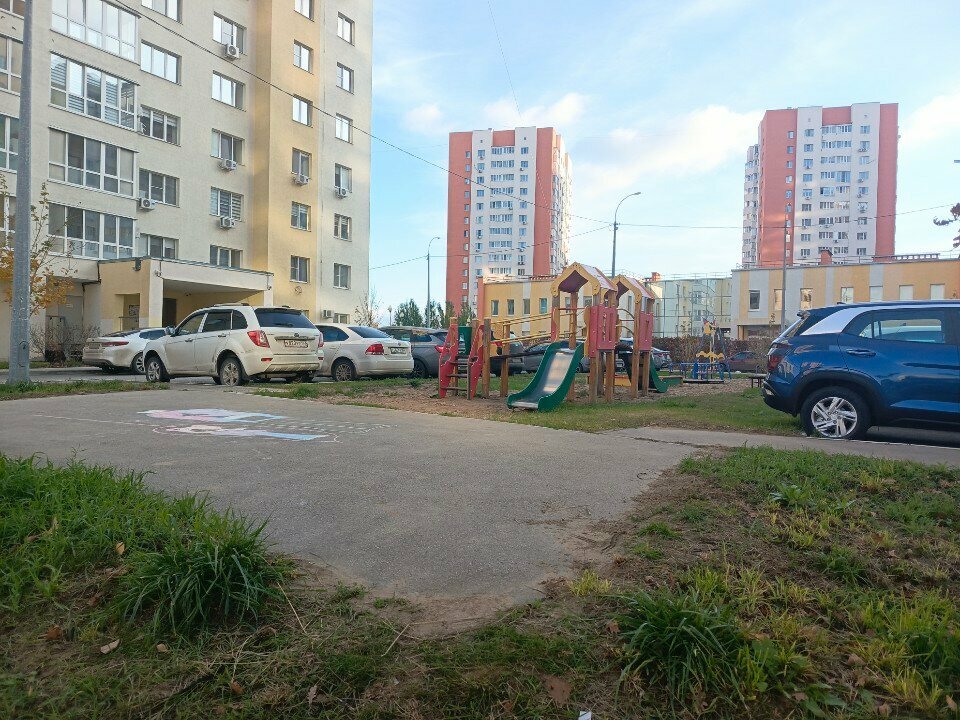 Игровая площадка перед домами ничем не огорожена. Машины ставят в упор к бардюрам и лавочке, того гляди заедут на саму площадку. Покрытие песочное. На коляске можно подъехать только с 1 стороны. С двух сторон примыкает парковка машин.