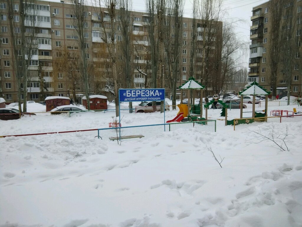 Площадка детская"Березка"расположена во дворе между домами, хорошая, солнечная. Оснащена горками, качелями, много лавочек, беседки, рай для детей, площадка огорожена забором. Конечно много машин вокруг, но забор защищает площадку и детей.