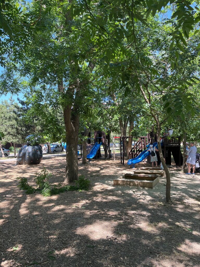 Отдыхаем в Анапе апрель, май 2025, каждый день гуляем на этой площадке, всегда много детей, есть с кем подружиться) было бы еще резиновое покрытие.... Качелек тоже нет, но просто как место притяжения детей - отлично. Много лавочек для родителей. Недалеко бесплатный туалет