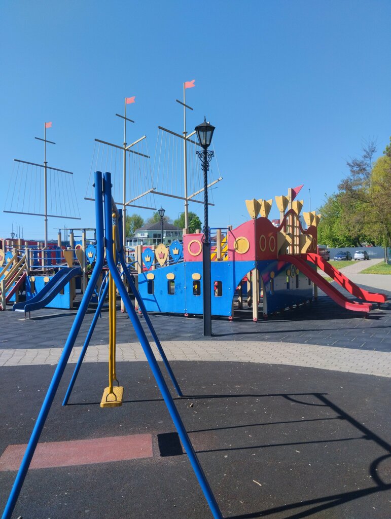 A large and interesting playground. There are swings and orcs. A huge ship with Slides. Trampolines are closed with stitches on weekdays