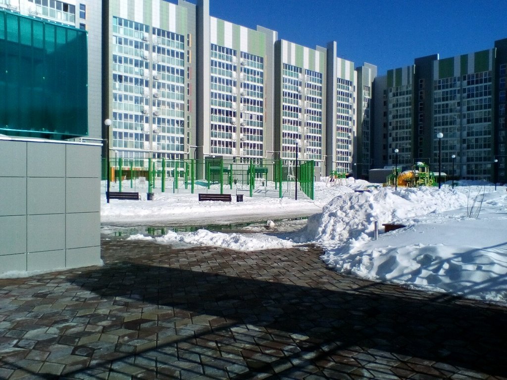 Двор просто супер, без машин под охраной - это самое важное! Много интересных горок, качелей, тренажеров, для всей семьи!