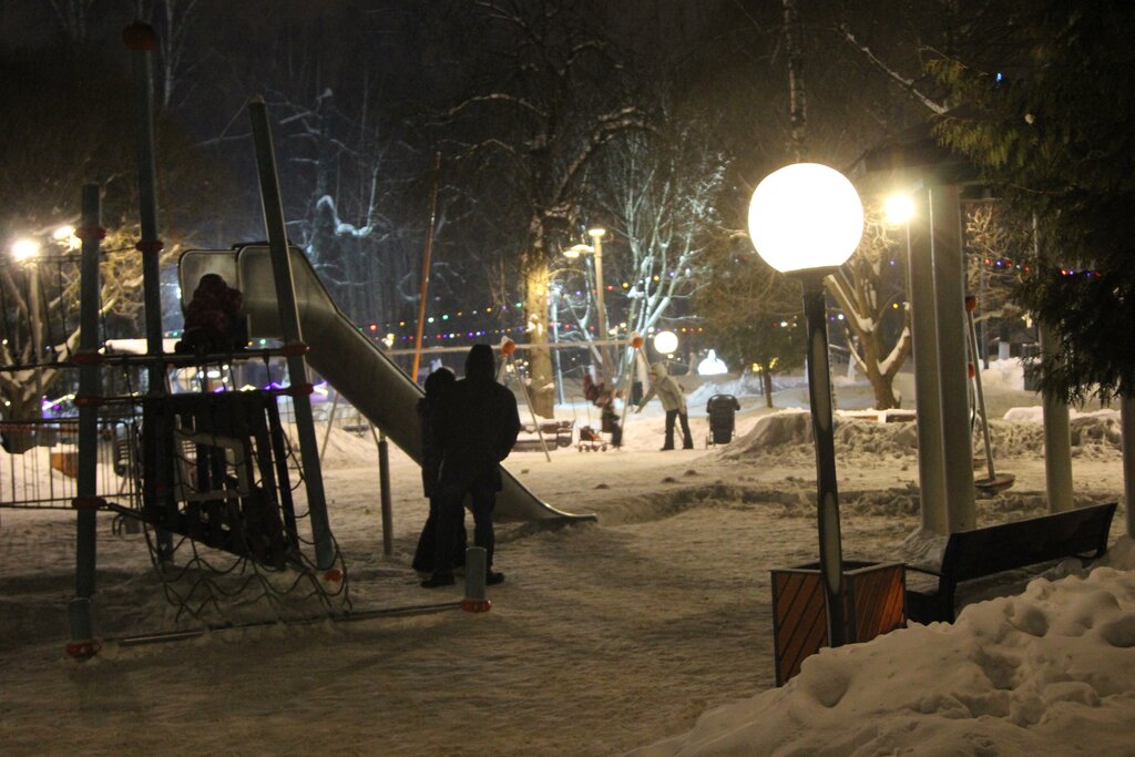 Обновлённая площадка с разным игровым оборудованием. Вокруг площадки установлены скамейки и светильники. За чистотой площадки следят. Даже в вечернее время много посетителей площадки.