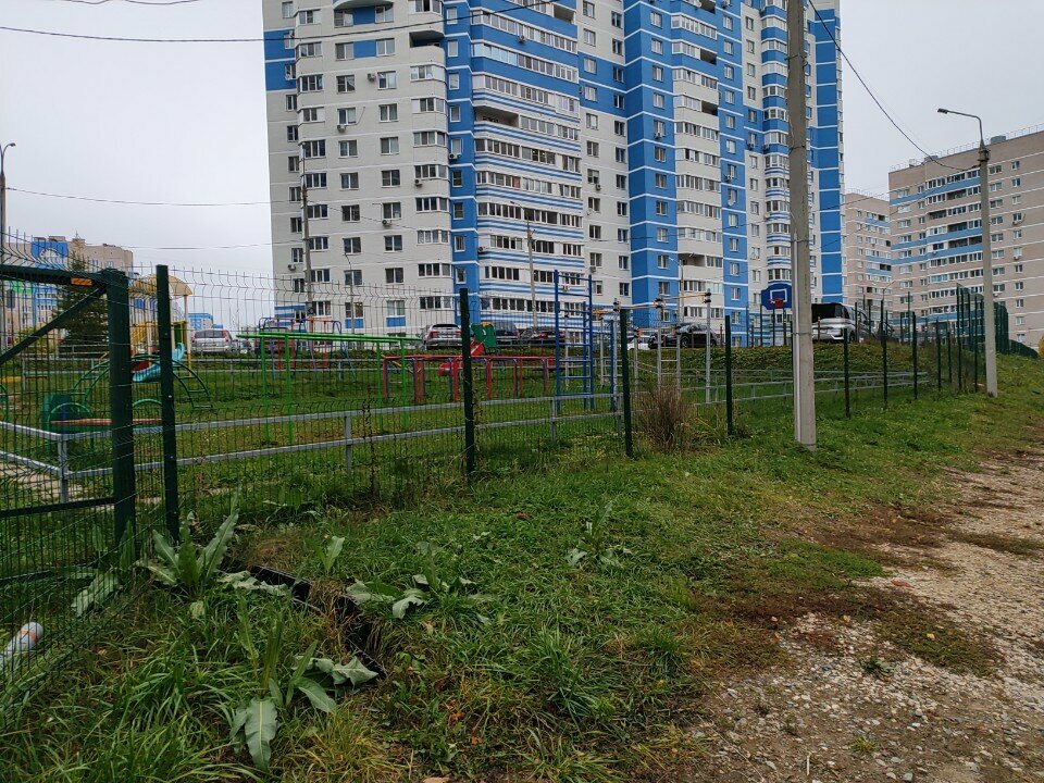 Спортивная площадка не продумана, грязная земля и кочки травы. Детский городок на пустыре, постоянно ветер, нет тени, чтоб спрятаться от солнца