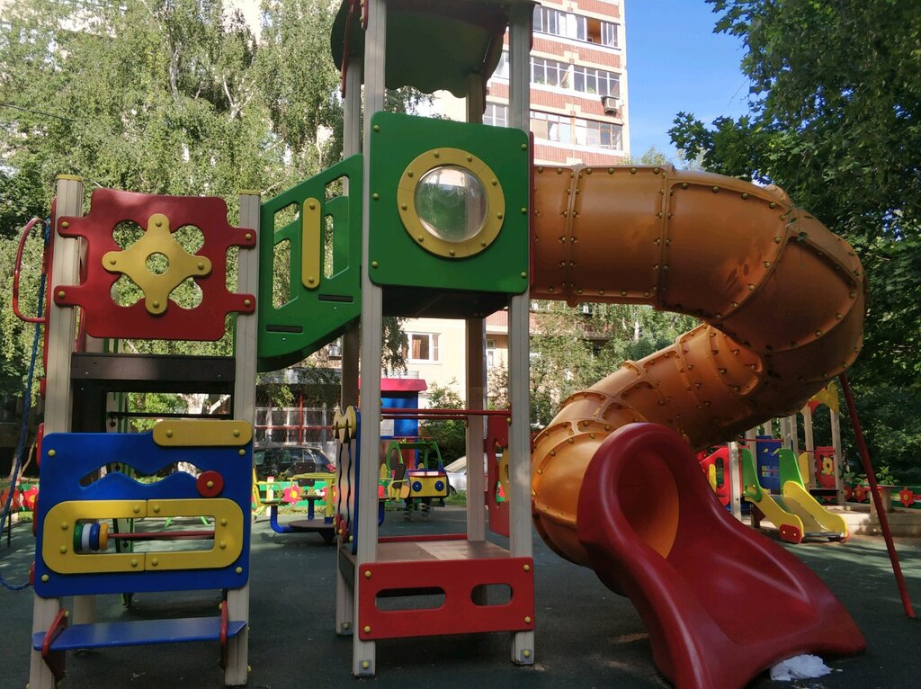 Детская площадка исключительно для самых маленьких детей. Игровые конструкции, как-будто для гномов. Спуск с горки заканчивается прямо в стойку баскетбольного кольца, что небезопасно. Спорт площадка рядом уже устарела, не пользуется популярностью.