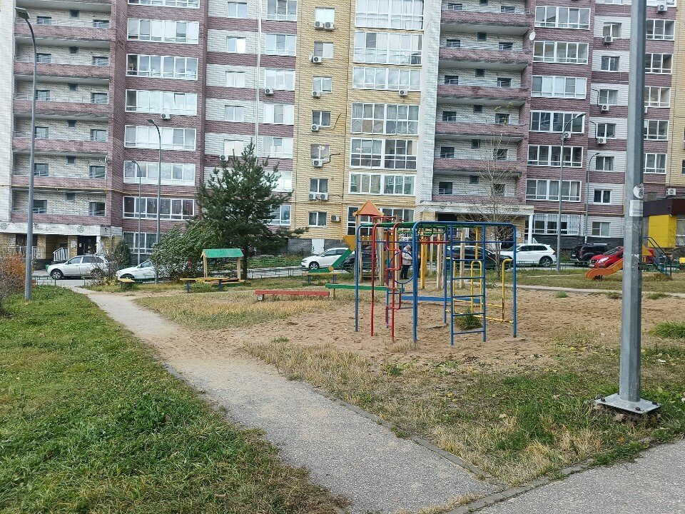 Стандартная детская площадка внутри двора. Конечно уже пожившая свои годы, требует в некоторых местах замены деревянных деталей, покраскт, ремонта металлоконструкций. Есть лавки, урны, асфальтные дорожки, песочницы, турники/лесенки, качели. В летний день в ясную погоду в полдень, тенька там не найти, но хорошо прогуливается там ветерок) так что решать Вам, о прогулке на данной площадке. Удачи)