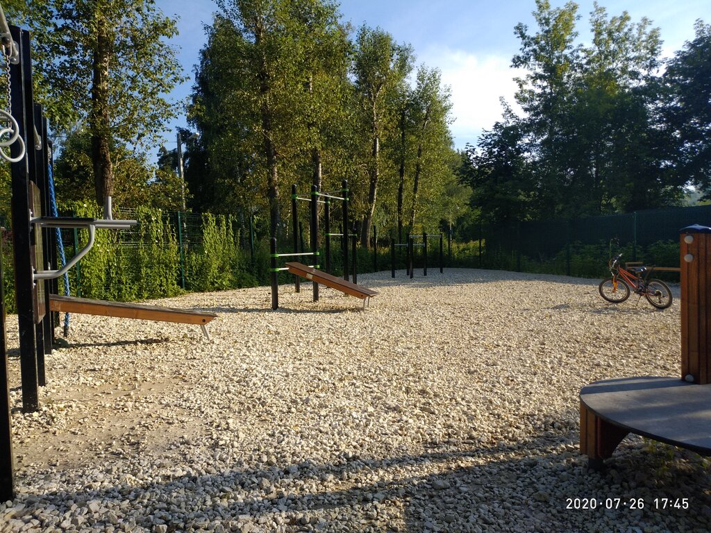 Удобное расположение, хорошие снаряды, всегда находяться желающие позаниматься. Днём часто находяться мамы с детьми разных возрастов. Младшие катаются с горки, а старшие осваивают снаряды.