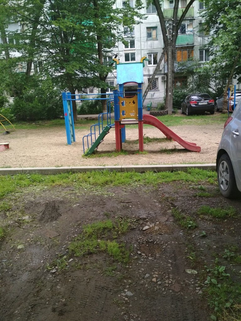 Сложно назвать это детской площадкой. Одна работающая качеля. Все остальное сломано. Старое трухлявое дерево, местами и его нет