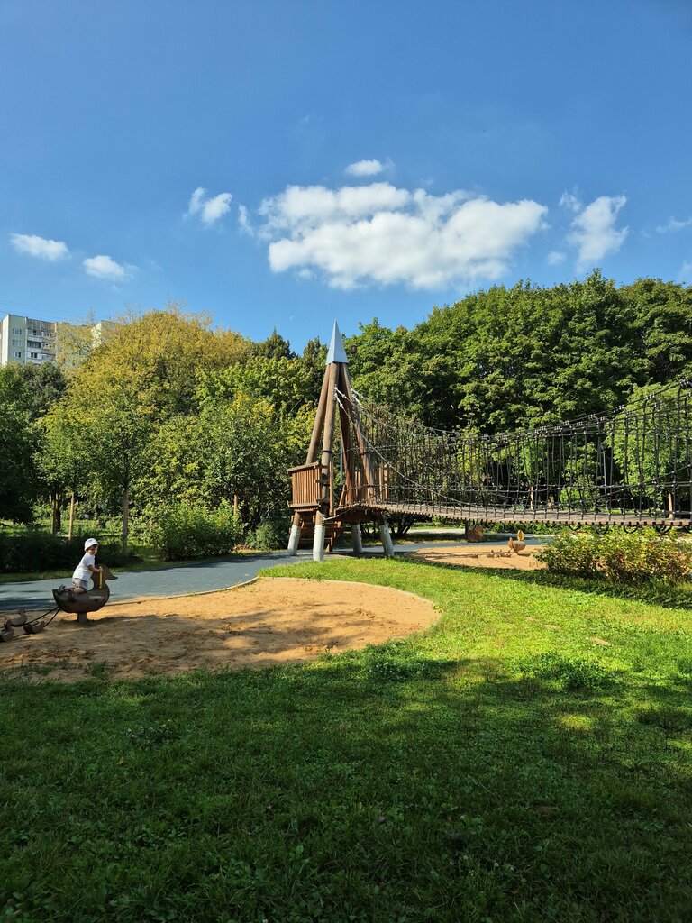 Хорошая новач площадка. Она и до ремонта была не плохой, но после стала больше в 3 раза. Имеются места для детей разных возрастов. Мостиком пользоваться не удобно из-за слишком больших ступеней с крутым подъёмом/спуском