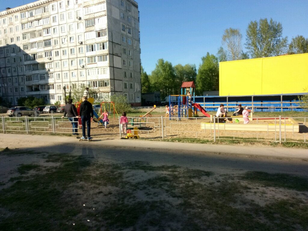 Стандартный набор для детей,но место есть,можно сделать и побольше развлечений для детей. Дома большие, детей много. Лавочек нет. Посидеть родителям негде,пока дети играют.