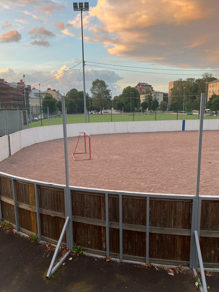 Территория объединяющая детскую площадку, игровое поле, на котором зачастую проводят спорт соревнования - свободного доступа нет.