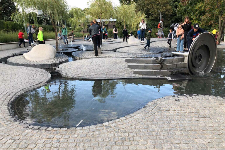 Самая необычная площадка из всех, что мы видели. Идеальна для посещения в жаркий летний день. Есть зоны в тени деревьев и на открытом солнце. Дети в восторге. Очень много подвижных элементов - мельницы, рычаги, фонтанчики