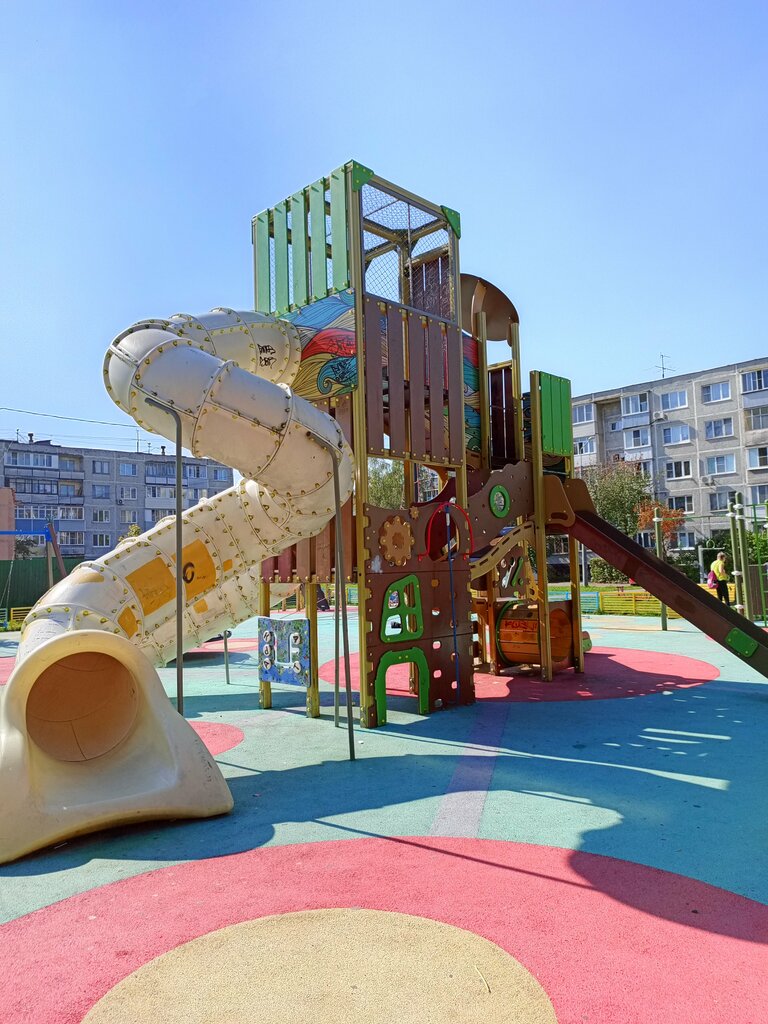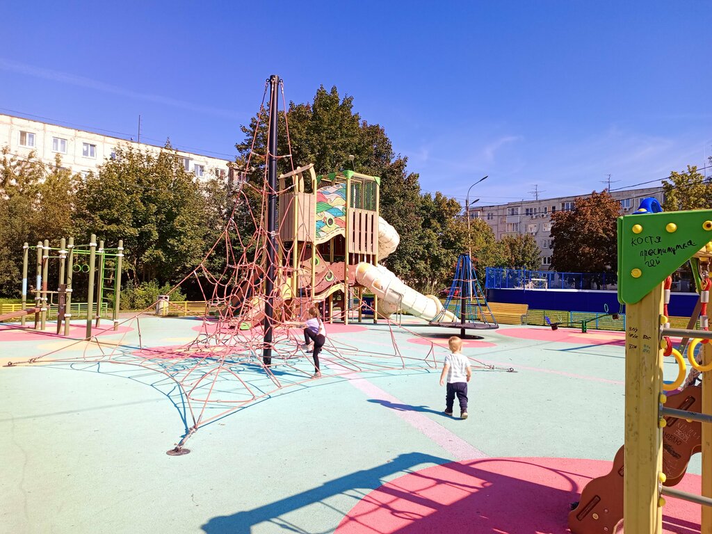 Большая площадка с разными активностями для разных возрастов. Рядом коробочка и тренажёры.