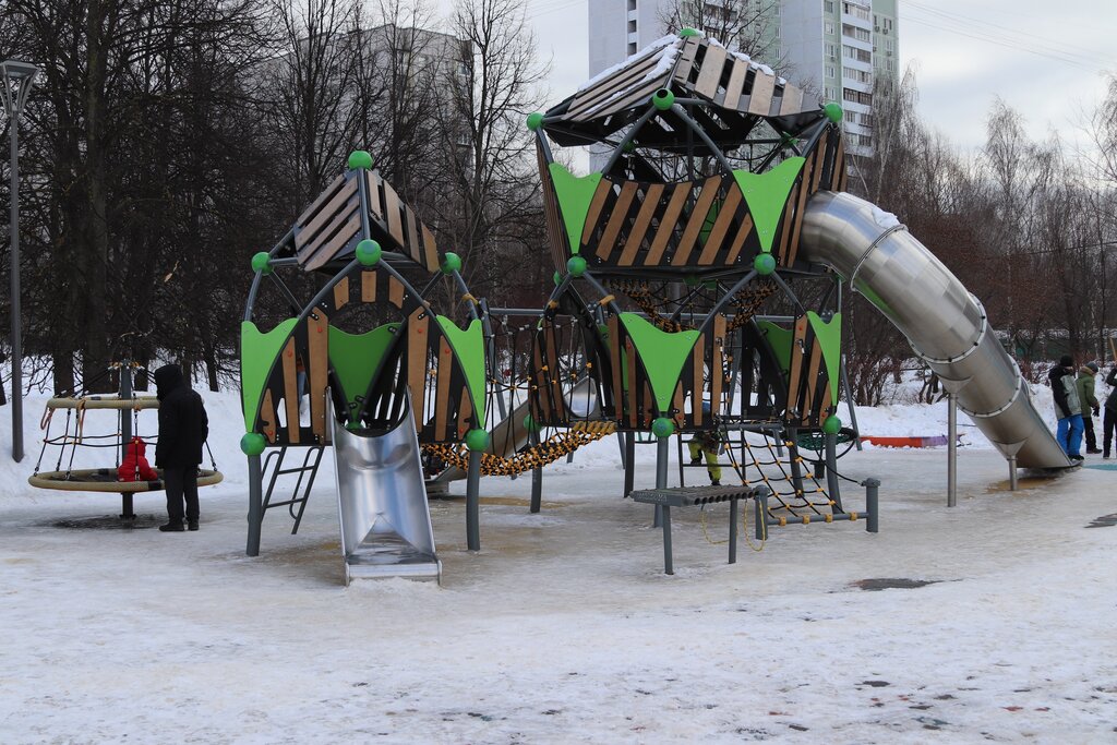 Любимая детская площадка. Для детей от 4 лет самое то😊Есть ларки с кофе, хот-догами и т.п. На площадке есть лавочки, беседки. Рядом пруд.