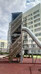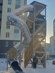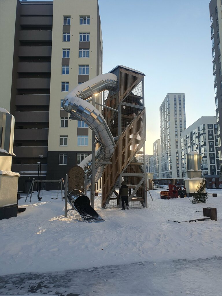 Это самая большая горка которую я видел на детских площадках. Чёрт возьми, она высотой с этажа 3-4! Залезть туда уже задачка не из лёгких, можно всю голову отбить, попутно узнав из надписей на стенах и ступенях много нового о местных жителях. У горки есть два тоннеля, один находится на самой вершине и представляет собой спиральную горку, с которой скатиться решится не каждый, но СПОЙЛЕР, на деле гораздо скучнее чем кажется — это вам не аквапарк. Второй спуск находится чуть ниже, но зато очень крутой и резкий. С него я к сожалению не прокатился, так как отморозил руки, но думаю он будет даже покруче