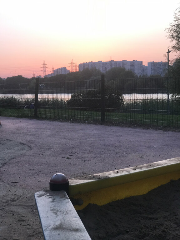 Маленькая симпатичная площадка, с видом на реку, но без единой скамейки для родителей(
