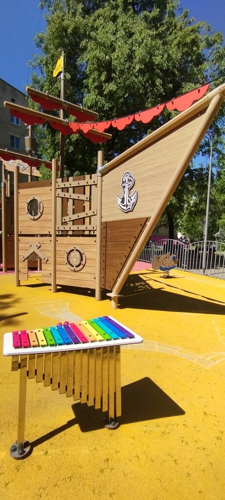 Небольшая, но интересная площадка для детей, огороженная со всех сторон. В центре площадки стоит парусник с горкой, а вокруг размещены разные игровые установки: качели, качалки па пружине, металлофон, ... На площадке установлены скамейки.