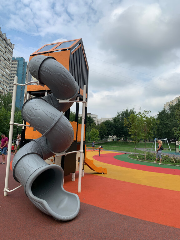 Ужас! Конструкции шаткие и валкие, покрытие в некоторых местах порвано, летом вонь невыносимая от резины которой укатаны детские площадки. Единственных плюс- это наличие ограждения.