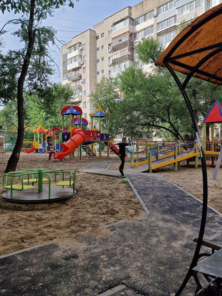 Детская площадка во дворе дома. Мы путешествуем по России в составе экспедиции "Уска путешественница" в Хабаровске остановились в отеле "Сопка". В поездке с нами маленький ребёнок и, конечно, ему нужны развлечения. Здорово, что здесь, недалеко от отеля, нашлась эта площадка. Много разных качелей, в том числе и качель "гнездо", качель "лавочка" карусель. Есть и горки и лазелки. Приятно, что площадка большая и вся полностью засыпана мягким песком. Можно строить замки, копать. Как на пляже. Чисто, мы ходили босиком. Спасибо тебе Хабаровск за это место))