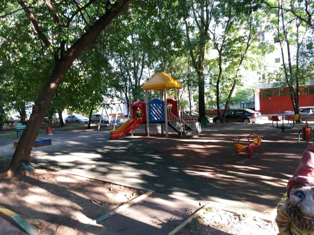 Тенистая площадка для деток дошкольного возраста. Обычно тихая и не перегруженная детьми. Качели двух типов, на которых можно кататься вдвоем, песочница и небольшая горка.