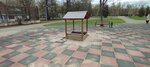 Небольшая площадка с очень скромным набором оборудования: качели, песочница, одна скамейка. На краю площадки установлены небольшие футбольные ворота, совмещенные с баскетбольным щитом с кольцом, и деревянная беседка.