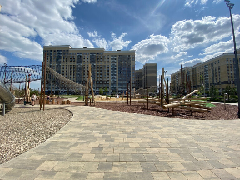 Отличная детская игровая площадка, спроектированная по уму. Место притяжения для всех жителей ЖК. Разделен на зоны для детей поменьше, постарше и спортивную площадку. Красивое озеленение и разнообразное покрытие площадок, которые сами по себе позволяют занять детей - выбирать красивые камешки или кувыркаться с зеленых холмов. При этом площадь плейхаба достаточна, чтобы всем желающим хватало места.