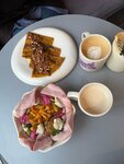 Приятная атмосфера, все вежливые и приветливые ☺️ флэт Уайт - отличный, крепкий как я люблю, зерна со сладковатым ореховым вкусом. Сырники порадовали интересным сочетанием ряженки и домашней нутеллы, кажется обжарены на кокосовом масле. Всё как я люблю 🫶 Заскочила сюда за порцией глюкозы после напряженного экзамена - спасибо, очень понравилось 🥰 чисто и уютно