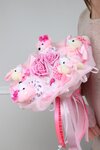 Букет «Розовые мечты»— это воплощение беззаботности и чистой радости. В составе 7 игрушек (4 зайчика и 2 мишки и 1 кошечка) Украшен цветами ручной работы, декоративными ягодами, нежнейшим пухом, лентами и кружевом. Диаметр - 34 см, высота - 43 см