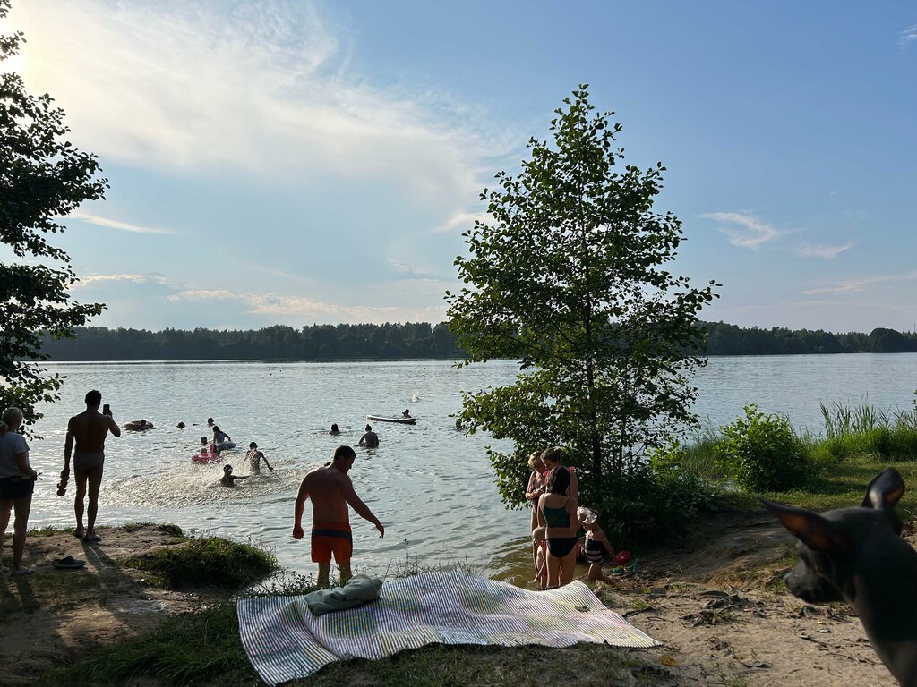 Красивое озеро. Много мест для пикника. Дубовая роща вдоль берега. Песчаное дно. Плавный заход. Есть рыба. Парковка есть. Недалеко магазин Пятерочка. Летом очень много отдыхающих.