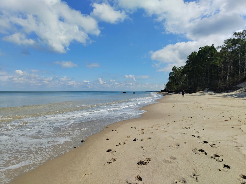 Тихое, уютное место, если уйти подальше, можно достичь полного уединения и покоя. Пляж достаточно широкий, от дороги отделен дюной полоской леса. Берег песчаный с небольшими вкраплениями камней, вода чистая