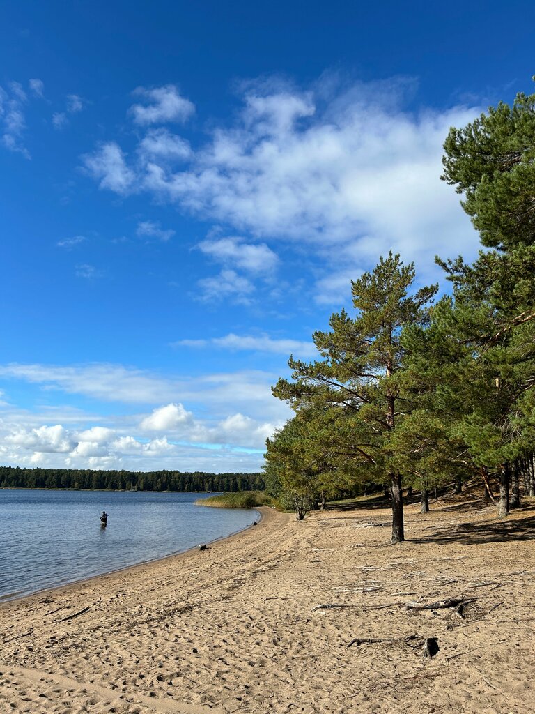 Великолепныйшее место для отдыха с детьми. Сосновый бор, песок, чистая, тёплая вода. Есть 4 беседки. Мы приехали в субботу в 9 утра, не было ни одной души. Заняли беседку под красивейшей сосной, можно жарить шашлык в специально отведенном месте, там даже 4 маленьких мангала. Плавали на лодке, ловили плотву, окуня, собирали чернику, есть лисички. Туалетов нет, под кустами близ озера нужно ходить осторожно. Парковка вдоль дороги, обочины узкие, но в один ряд стояло много автомобилей