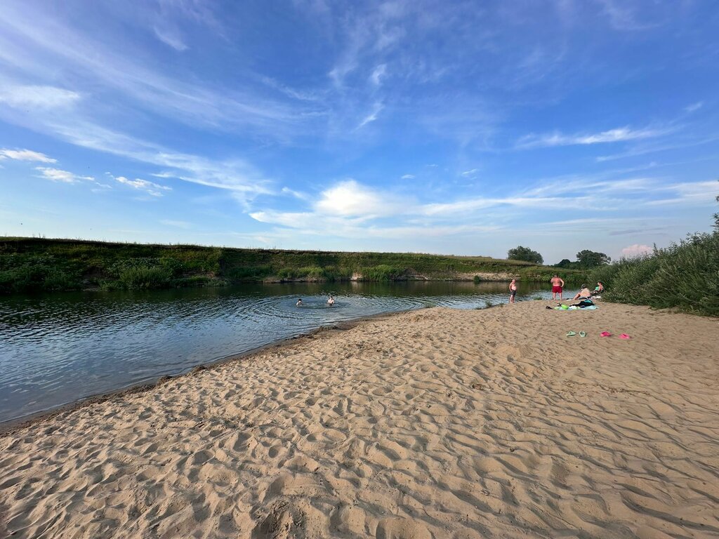 Песчаный берег и дно реки. Мусора нет. Людей выпивающих мало, практически нет. Много родителей с детьми. Удобный подъезд на автомобиле.
