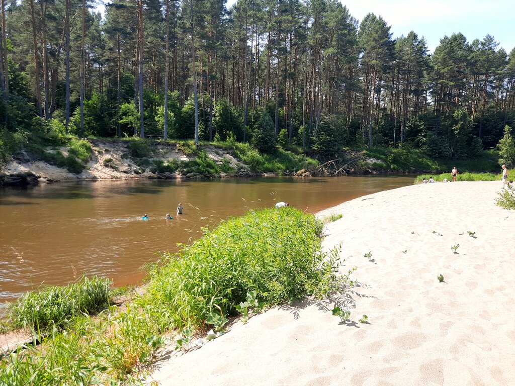 Отличное место. Много площадок для размещения с палатками. Пляж песчаный, песка очень много, в солнечную погоду песок очень горячий. Купаться хорошо, есть место и для детей, где не сразу глубина начинается. Течение реки умеренное.