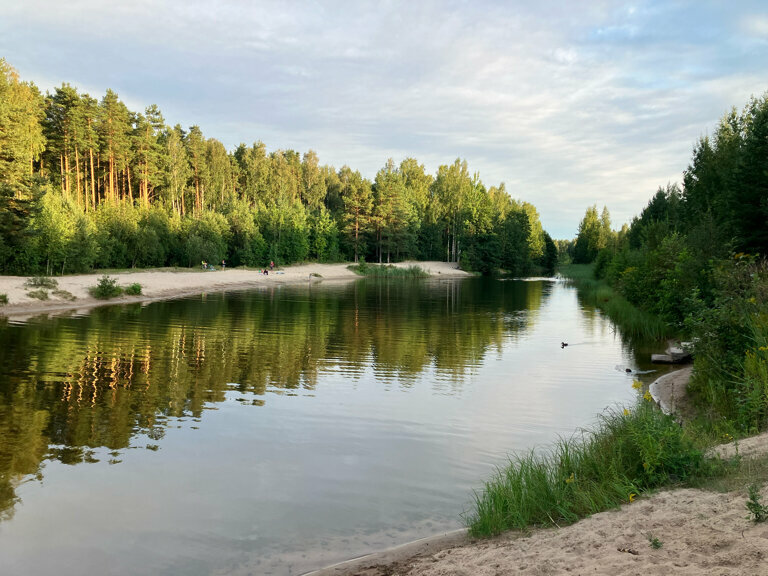 Летом там прекрасно! Песчанный пляж, а главное, песчанное дно и чистая вода позволяют там купаться взрослым с деткам. Вода прогревается быстро. Граничит озерцо с сосновым бором. Красота!