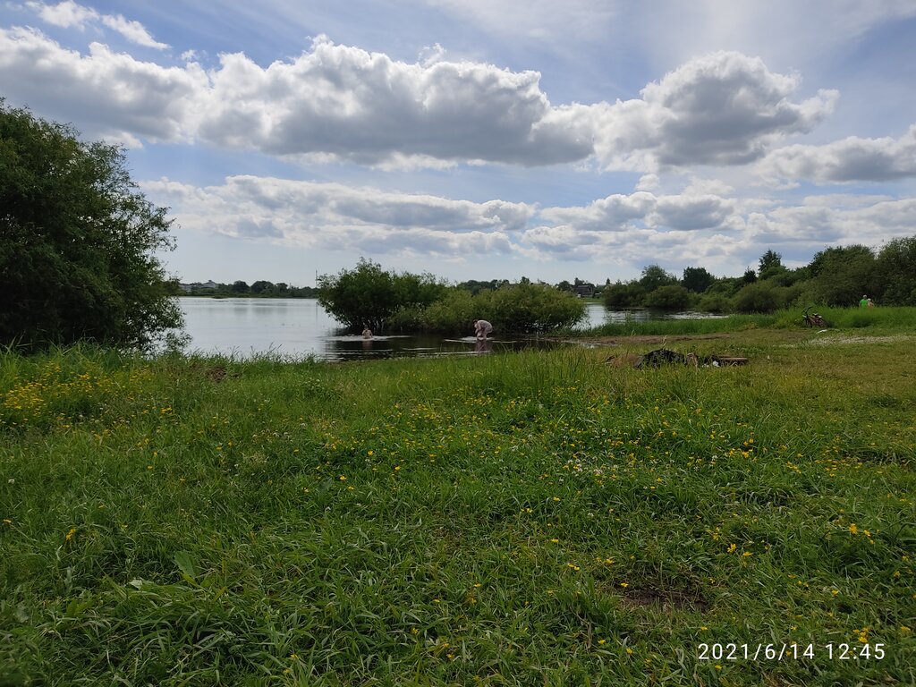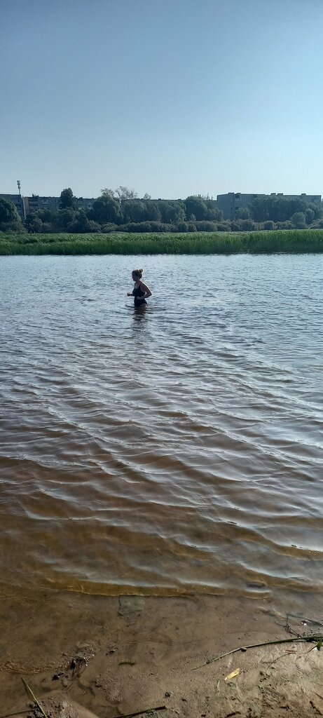 Место хорошее, мелкий кустарник, травянистый пляж, песок только у воды. На момент купания(середина августа 2022)уровень воды упал, пляж увеличился на 7-10 метров по сравнению с началом лета(по словам местных жителей). Можно пешком перейти на другой берег по илистому дну, песчаное дно только до 4-5метров от берега, ширина в месте пляжа метров 20. Выйти на другую сторону реки не получится, весь противоположный берег зарос густым камышом. Вода зелёная! Много ключей, местами вода была прохладной. Пока купался, заметил плавающего по верху воды подлещика. Поймал его голыми руками. Почему рыба плавает таким образом многие знают........кто не знает пишите комментарии, отвечу! Днём ранее купался в реке Волхов в районе Юрьева монастыря. Отличное место, вода теплая, пляж песчаный, есть высокий теневой кустарник. Тихое течение👍. Единственный минус реки Волхов множество улиток и ракушек, приходится аккуратно заходить в воду, есть опасность травмировать ноги порезами(за пол дня купания порезал два пальца).