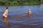 Ну пляж как пляж. Есть несколько скамеек с зонтиками для старичков. Главное - весьма чисто, никто не приходит с большим количеством еды и не мусорит. Могу отметить, что одно из немногих мест, где народ не сорит. К чести города Гороховец. Песок так себе - нативный, река мелкая в межень переходится вброд, а вот течение - сильное, плыть против него - не в жилу, что на лодке, что без. Дно хорошее - песчаное, хотя много беззубок и жемчужниц, но об них ноги не ранишь. Перед буйками выкопана яма, чтобы можно было заглубиться. Отмечу, что дно неровное - могут быть перепады 20-25 сантиметров (это для тех, кто боится и не умеет плавать)
