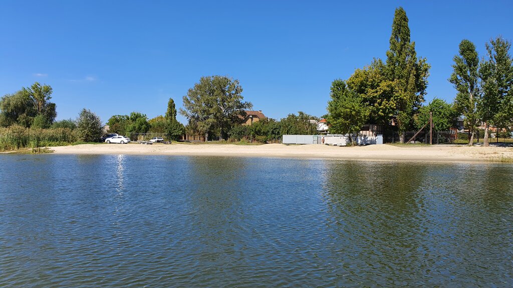 Небольшой уютный песочный пляж. Песок привозной, вход в воду удобный. На берегу натянута сетка для игры в волейбол. На другом берегу на острове - станица Елизаветинская.