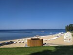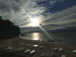 The beach of the sanatorium "SOSNY" is located in a very convenient location. It's especially nice here during the day! In the evening, this is the perfect place!! Even if it's cool outside, the beach area is much warmer due to the sunlight from the setting sun. The effect of heat is enhanced by the reflection of the sun from the water and the protection of the beach from the back by a wall. On September 27, I also swam with great pleasure! The water is invigorating! You come out of the water cheerful and young, full of energy! The wind doesn't even bother, because it's such a state that you don't feel cold. You walk on concrete tiles barefoot, as if on a warm floor. Of course, then I put on a warm bike with a hood and drink delicious sea buckthorn tea in a beach cafe of my own production.