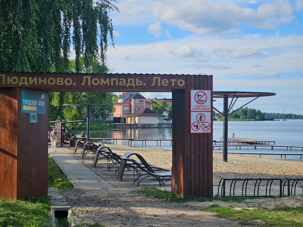 Пляж сделан неплохо,но практически нет тени(две качалки с крышей,котрые заняты бабулями ещё наверно с начала строительства,ибо за неделю я не видела их свободными ни утром,ни вечером)Поставили зонтики типа с рассеянным светом(спрашивается ЗАЧЕМ?ДЛЯ КРАСОТЫ?Потому что тени они в +30 никакой не дают,и по сути они просто торчат из песка,чтоб торчать).Поставили шезлонги в разных степенях наклона(примерно 8 шт.,если вам повезёт можно один какой-нибудь и подкараулить свободным,но сидеть на них-то ещё удовольствие в жару).Ну и конечно-типичное Людиново:мусорки полные,мусор в воде,мусор на песке(но это больше к людям претензия,баки мусорные вывозят регулярно)Подводя итог вышесказанному:сам пляж явно не продуман,задумка хороша-но исполнение хромает.Ну и если жители города не перестанут быть свиньями,так и будут жить в свинарнике)