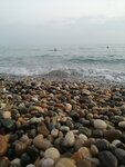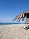 Nice beach. There are sun beds and umbrellas. For a fee, but for the whole day. Entering the sea by pebbles, but it is very useful))) or in aquabots. There is a marina nearby and you can ride a ship that goes to sea every two hours. The sunrises and sunsets are magnificent.