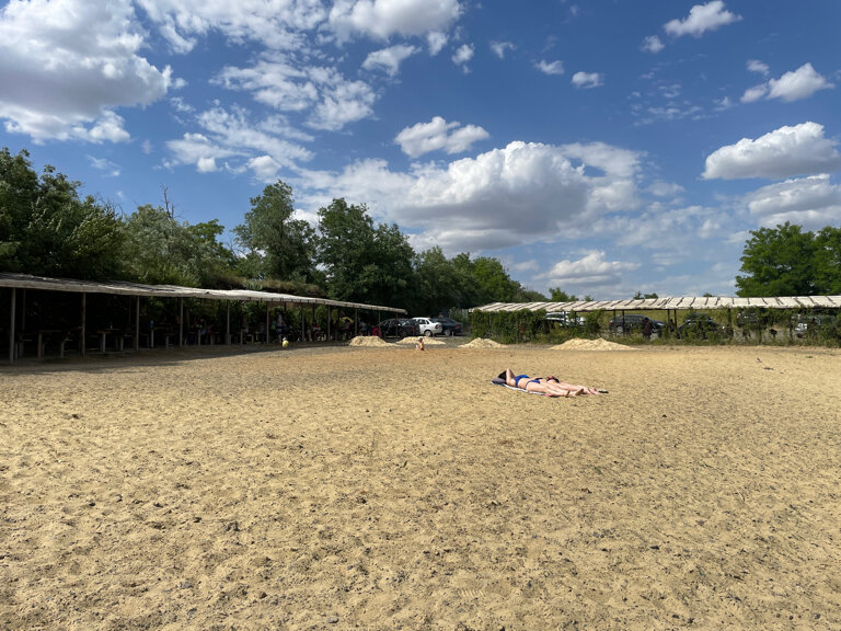 На пляже почти не осталось песка,все заросло травой. Столики и скамейки старые,но рядом с каждым есть большой мусорный пакет. Беседки расположены таким образом,что можно укрыться от палящего солнца. Есть мангалы. Качель и вышка очень старые,неухоженные. Заход в воду неплохой,нет резкого перепады,для детей достаточно хорошее место,но попадаются камни,которые неприятно впиваются в ноги. Впечатление осталось двоякое,с одной стороны тихо,природа, тёплая вода,но с другой обветшалые беседки,отсутствие песка.